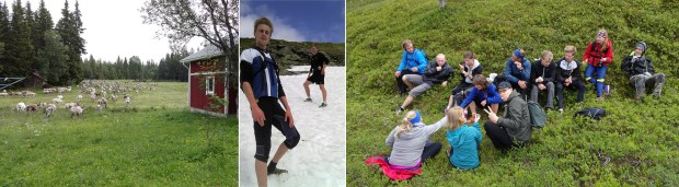 Renar runt stugan. Jesper och Andreas i snön. En del av gänget pausar under en av vandringsturerna.