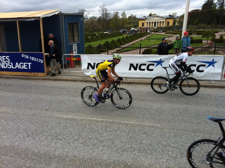Benen kändes på gång under uppvärmningen, och temperaturen bara steg under förmiddagen, kändes som att det kunde bli ett bra race. Fick en småstrulig start där jag missade att fästa foten i pedalen, så jag fick jobba ikapp en del under första halvan av första varvet. Men jag kom ikapp bra! Kände mig riktigt stark uppför den långa stigningen upp till slottet. Några varv rullade på, pulsen steg rätt bra uppför, men allt kändes väldigt kontrollerat. Råkade hamna uppe i spets bitvis, drog både upp och nerför backen och lite till. Kände mig stark men insåg att det var en bit kvar av loppet också så jag lugnade mig lite. Körde på något varv till och insåg att fältet hade spruckit upp ganska ordentligt bakom oss och vi var kanske drygt 7 pers i täten. Kul!